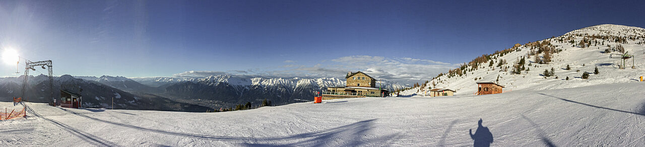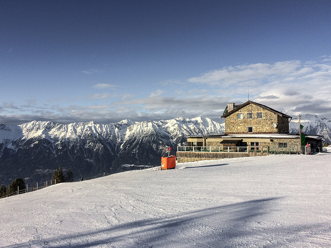 Ziehweg bis zur Piste ist größtenteils aper, Schitragen ist also bis zum Einstieg in die Piste angesagt. Kurz vor dem Schutzhaus hat es erfreulicherweise aufgerissen und ich hab die letzten Sonnenstrahlen beim Abfellen genießen können.